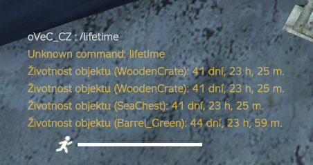 | /lifetime | Tímto příkazem může hráč zkontrolovat životnost předmětu a také vzdálenost od vlajky. |
