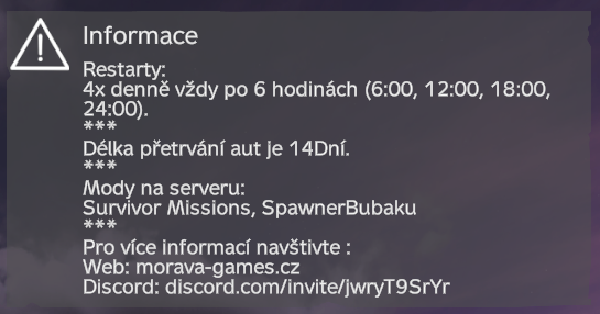 | /informace | Vypíše informace o serveru (restarty, životnost aut, Mody atd…). |