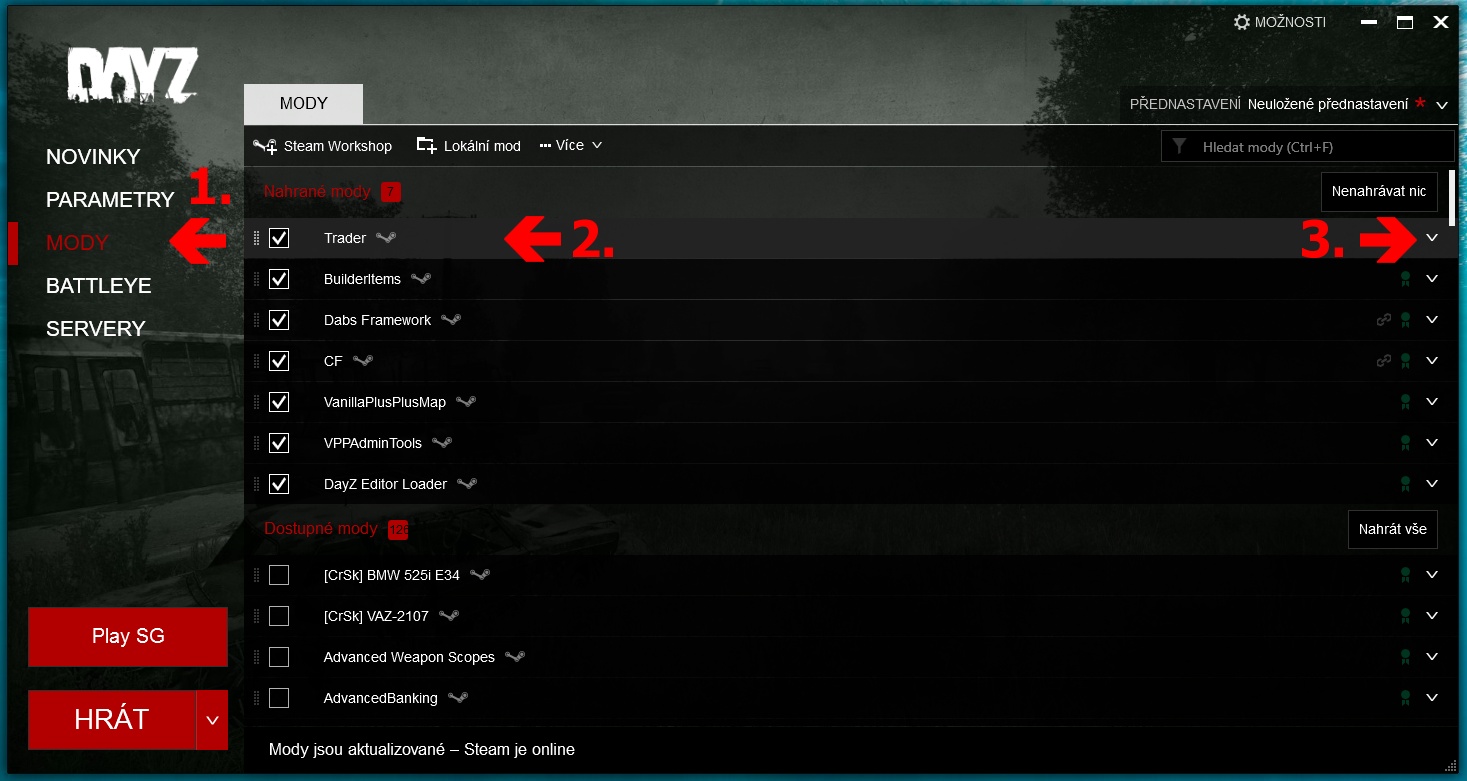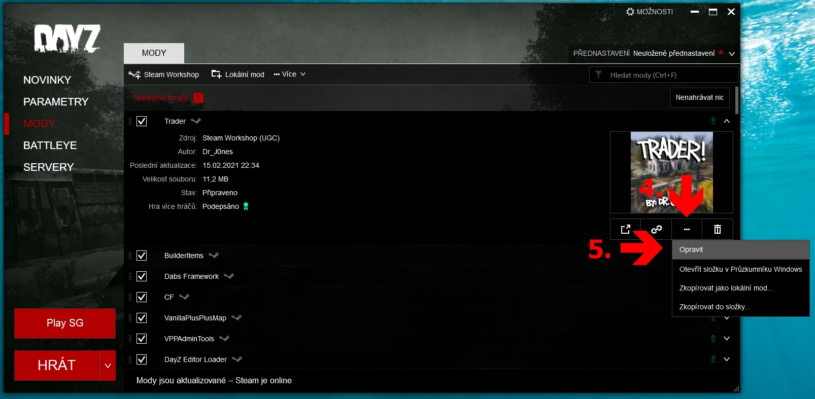 - Po otevření nabídky u módu klikni na 3 tečky „…„